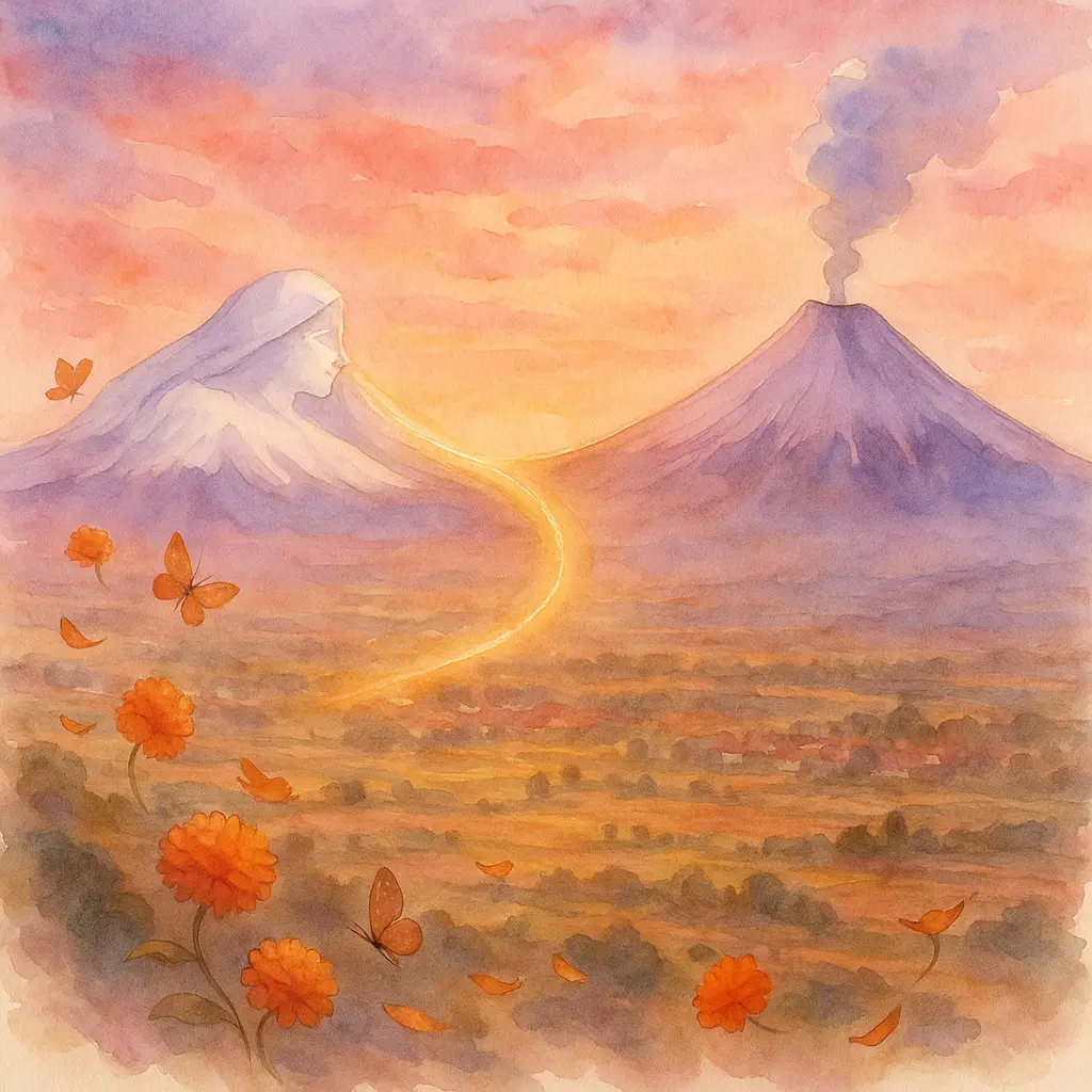 En los tiempos antiguos, en el valle de México, vivían Xóchitl —una joven hermosa y bondadosa— y Huitzilin, un valiente guerrero. Desde niños, compartían un amor puro que ofrecían cada tarde al dios Sol, Tonatiuh, pidiéndole bendecir su unión....